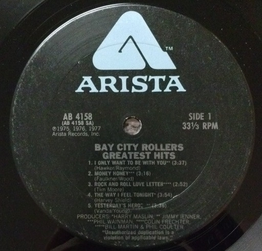 [url=http://www.discogs.com/label/376197-Columbia-Records-Pressing-Plant-Santa-Maria]Santa Maria Pressing[/url] with variant labels from [url=http://www.discogs.com/Bay-City-Rollers-Greatest-Hits/release/1866635]other U.S. copy[/url] with same cat#.A1. I Only Want To Be With You 3:37