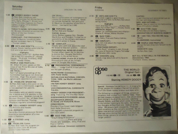 The following is a program of things, persons or situations that existed from 1948 to 1960. There are two viewpoints stated heron; that which comes from sitting in front of the television watching Howdy Doody, and that which comes from sitting in the kitchen listening to the radio. Sometimes our thoughts drifted from one medium to the other. We present both viewpoints. These are both situations as they actually occurred. So, sit down now and put yourself back in the situation that was yours during that period and return to these things, persons or situations that are no longer present!